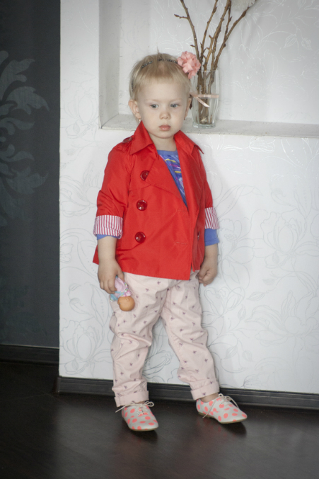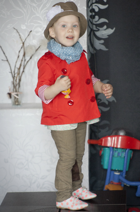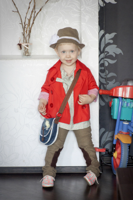 Шитье одежды, выкройки, ремонт одежды, шторы, швейные машины (уже приобретенные)Делюсь с вами новосшитыми вещами=))Сщила я малышке вот такой жакетик-плащ,ткань плащевка,захотелось мне именно жакетиком сшить,подклад корейский хлопок,так же вот такие штанцы-джинсы и шляпу,к ней сделала цветок пион,образы дома пробовала разные еще давно,забавно так,фоток разнообразных мало,т.к. наша принцесса вредничать начала,раньше на фотосъемку час-2 могли потратить,а теперь минут 20 и досвидание,пришлось достать игрушки,которые припрятаны были(мы меняем периодичсеки их,одни убираем,другие достаем,что не приедались),ее это впечатлило и еще хватило на съемку немного,только вот одевать пупса ее мне пришлось подбегать,вообще,я взмокла пока шел процесс съемки,надеюсь у нее это временно явление.