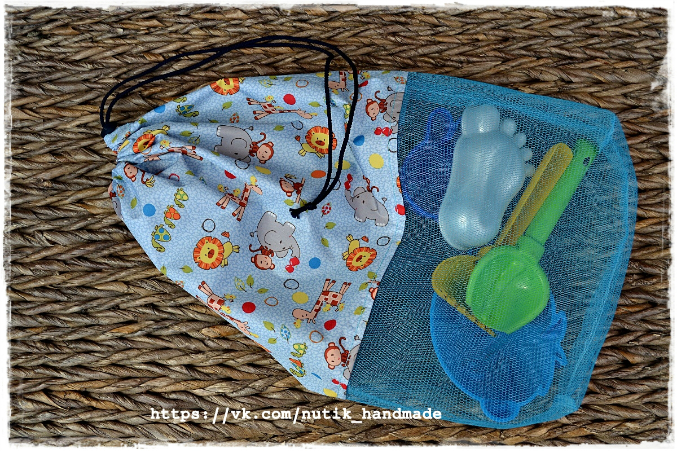 Сумка для песочницы. Идея не нова, мамочки хвалят :) суть в том, что дно сумки- сетка и пока идешь домой, песок высыпается. Только я подумала, что мне практичнее делать не сумкой с ручками, а таким вариантом.