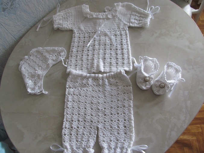 Вязание крючком (РАБОТЫ И СХЕМЫ)связала для Крестной моего сынишки, которая ждет доченьку и буквально на днях станет мамой. Увидела на просторах интернета такой и непременно захотелось связать, а тут и повод есть! Сотворила я это чудо очень легко - буквально за три недели, несмотря на то, что вязать было практически некогда, вязала в основном утром с 5 до 6.30 или по выходным, во время "тихого часа" - часа по два. Сама не понимаю и когда я это успела??? Ну а пока комплект лежит у меня дома ждет счастливых новостей! (Под срезом много фото во всех подробностях). Добро пожаловать в этот мир, Малышка!