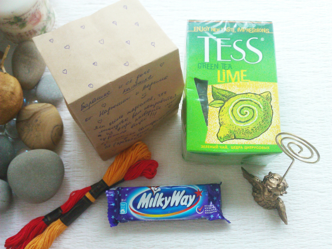 Одну шоколадку Киндер Катюха сразу сточила, поэтому ее уже нет)) Ми-ми-ми, столько сердечек на пакетике))))))) Надюш, слов нет, все с такой добротой делалось! А я со своим фарингитом "села в лужу"(((