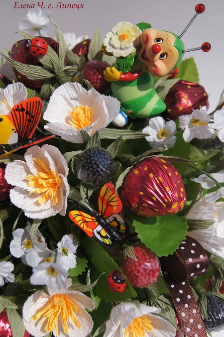 Спасибо, Оль! Да сегодня за ночь моя полянка выросла. Ежевика и малинка это мармелад Фруттелла, завернутый в пищевую пленку, это, конечно непозволительно работать с пищевыми продуктами в частности с конфетками без оберток, все же для клиентов, думаю, такой вариант не айс Но эта работа, что называется, для своих предназначена, сеструшке придарю, поэтому и ничего страшного, что я с ягодками контактировала. Красная бумага это полисилк обычный, желтые точки легко изображаются гуашью, вот и весь секрет. А цветочки можно и с конфетками состряпать, но мы же к натуральности стремимся, как бы вроде конфет достаточно, (упаковочка Куполов ушла и упаковочка Фрутелки) чего перегружать конфетищами, цветики больше в качестве декора, да и сама я сейчас глядя на фото, не могу представить в цветиках конфетки, как будто лишние будут они там. Можно еще мелкие конфетки типа эклерок заворачивать в полисилк салатного цвета, как неспелые ягодки, но у меня к сожалению такового не оказалось, поэтому недозрелых ягод у меня не получилось изобразить, вся полянка созрела сразу
