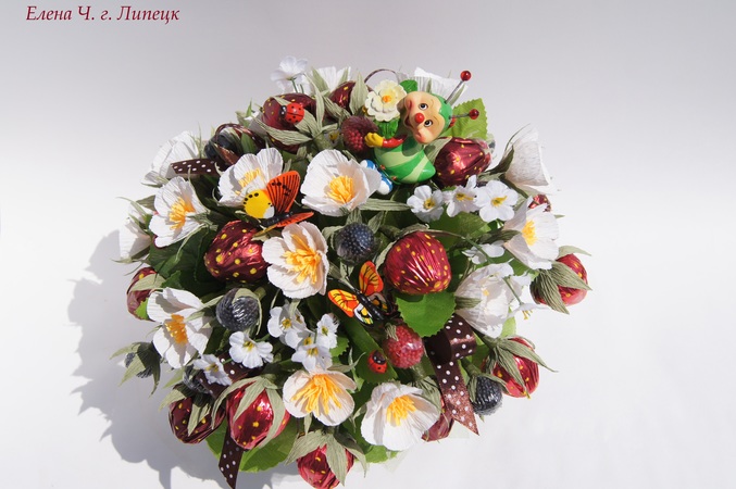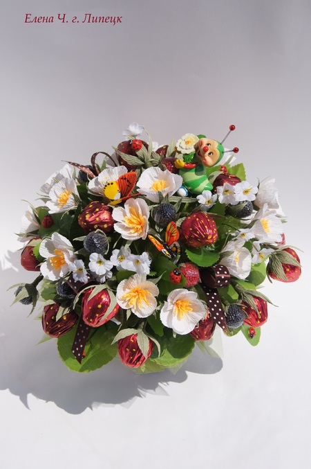 Здорово,Лен,когда же ты успеваешь красоту эту делать,ночами не спишь?а ежевика и малина-это из чего? И давно вопрос возник,а в какую такую бумагу красную с желтыми пупырышками клубничку заворачивают?В общем,классно,по-летнему,бабушкину деревню напоминает,а большие белые цветочки сама делала,из гофры?просто я подумала,чтоб вместо тычинок конфетки туда бы?