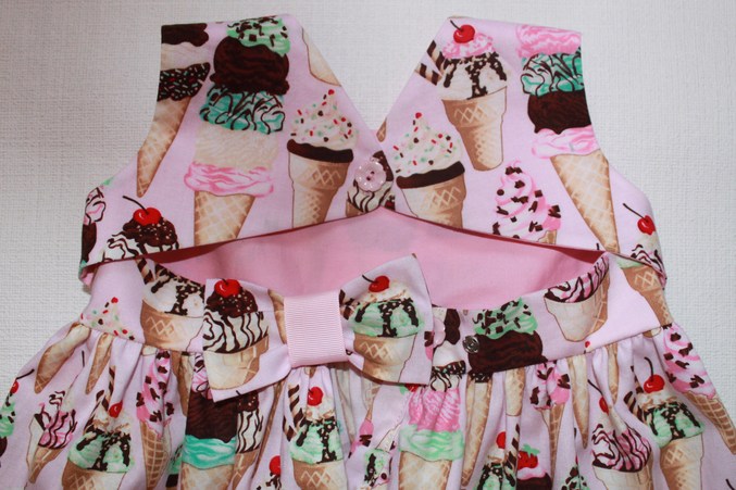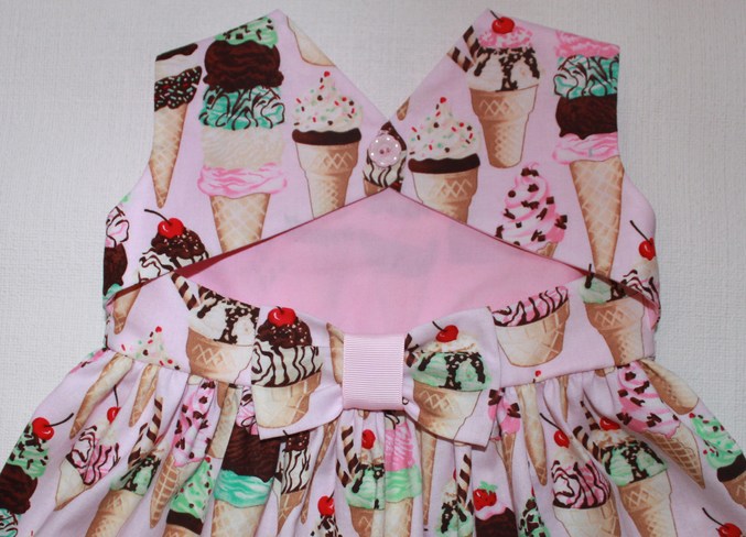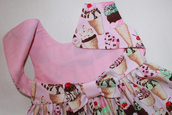 Застегивается дополнительно на пуговицу, спрятанную под бантиком, он именно для этой цели, а не для красоты,поэтому из основной ткани, чтобы сильно не выделялся. Тут немножко, совсем немножко, видно застежку. Хотела еще пуговичку-мороженое вместо обычной, но петля получалась очень огромной.