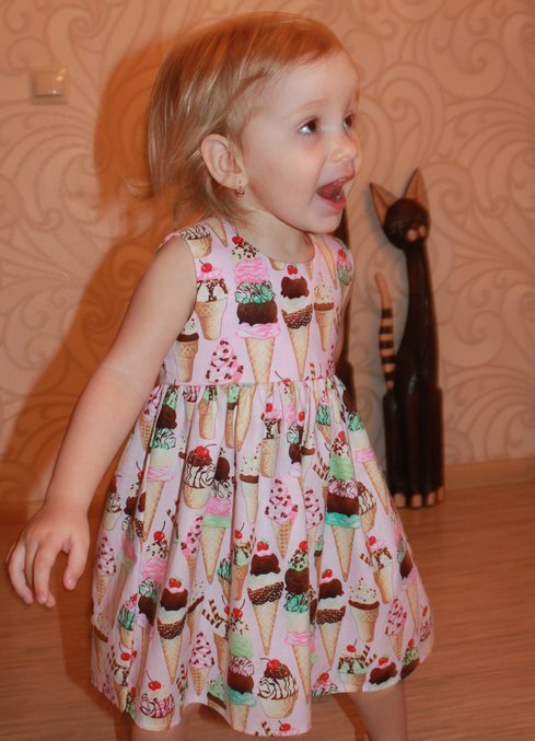 Кофточка эта вообще неожиданная спасительница, так бы и пролежало оно раскроенным, а дочка выросла бы, я-то искала что-то розовенькое в компанию, а с этим цветом и платье смотрится ярче и интереснее.