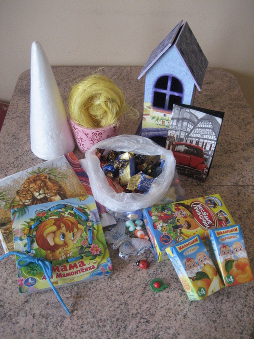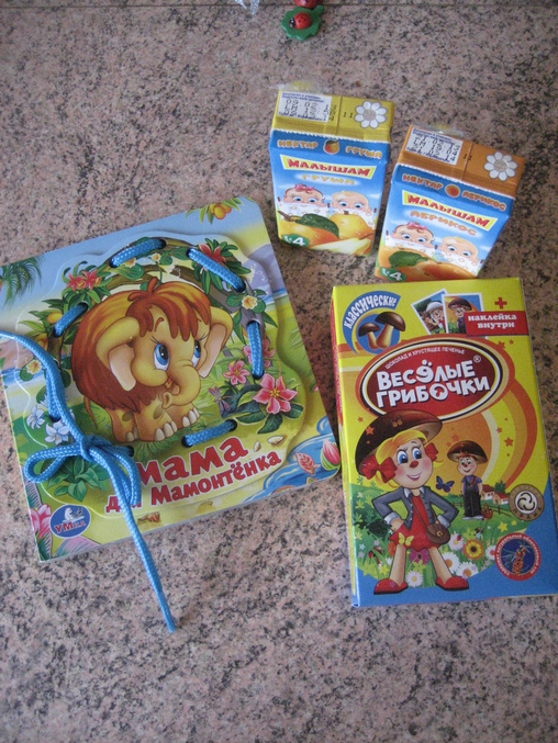 Подарки для сыночка - любимые шоколадные грибочки, соки, необычайно яркая добрая книжка с красивыми иллюстрациями и трогательной историей мамонтенка))