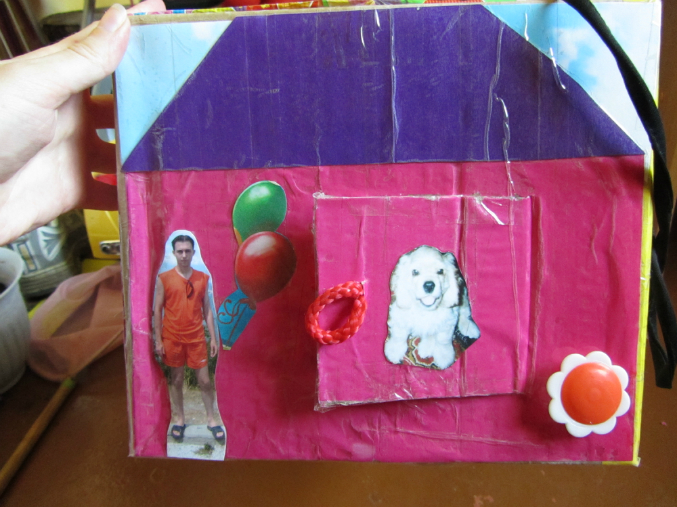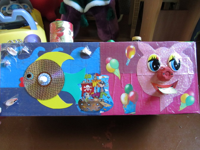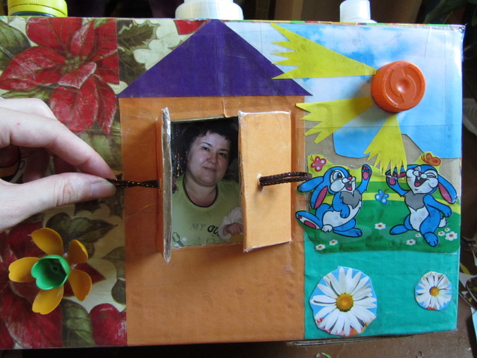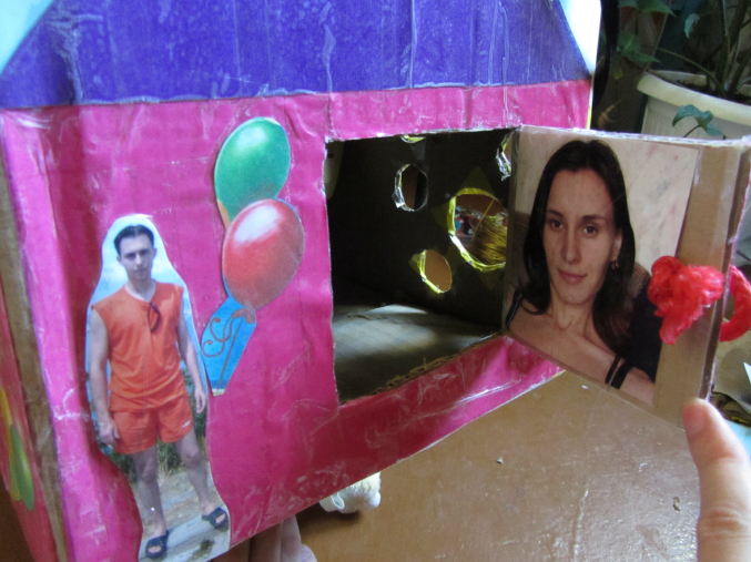 Дверь чтобы доставать фишки которые съела хрюша. Рядом с дверью любимый папа, а внутри спряталась мама. Сыночек очень рад когда находит фотку.