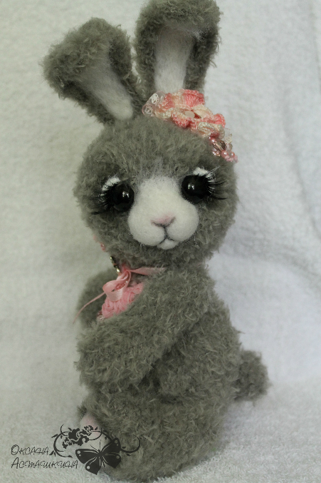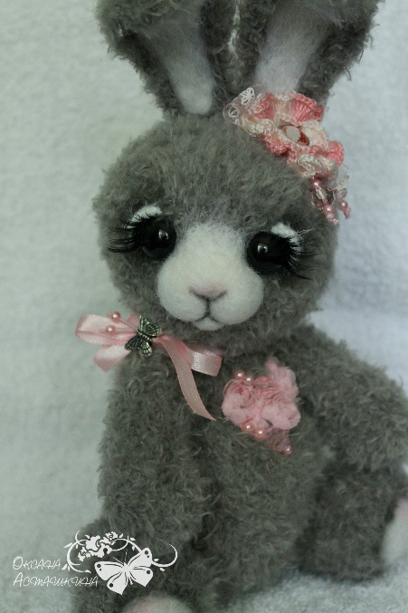 Зайка Мия трогательная, нежная зайка с большим добрым сердцем! Связана из фактурной пряжи производства США, шплинтовое соединение лап и головы, набита холофайбером, мордочка и подошва на лапках- сухое валяние, аппликация - розовое сердце из розочек и бусин из чешского стекла, подвеска бабочка, украшение на голове - цветочек из хлопковой пряжи с бусинами и брадс "пироженое". Рост 23 см без ушек, 29 см с ушками.