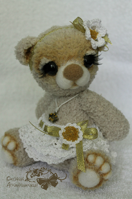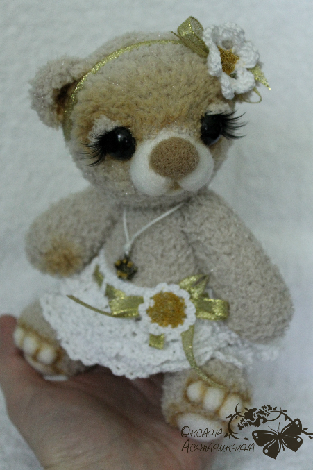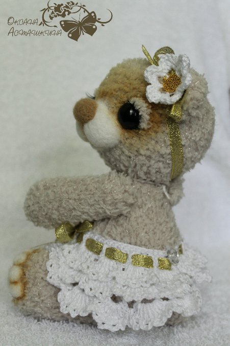 Мишка очень хочет стать принцессой! Связана из мерцающей фактурной пряжи, шплинтовое соединение лап и головы, набивка холофайбер, тонирована масляными красками, мордочка и подушечки на лапках - сухое валяние, подвеска корона, юбочка из хлопковой пряжи, с золотистой лентой и цветочком с микробисером.Размер 20 см.