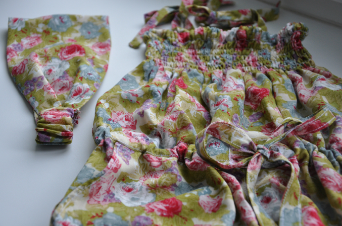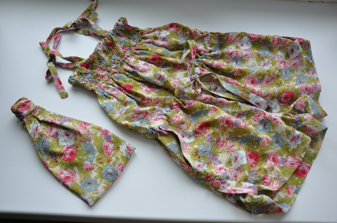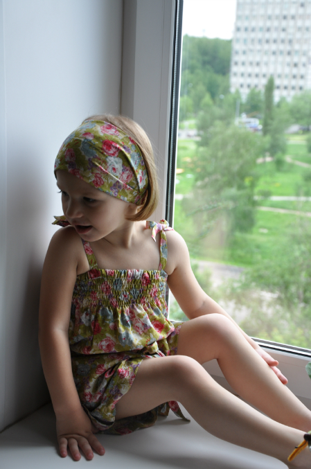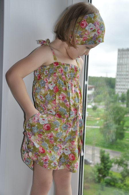 В общем пошился такой летний комбезик для старшей дочки из штапеля. Надо сказать, тканька не особенно легкая в шитье - все скользит и куда-то "едет")))