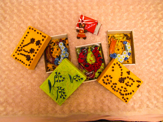 Солёное тесто (ТОЛЬКО ГОТОВЫЕ РАБОТЫ)....в продолжение сегодняшнего поста,хочу добавить немного фото упаковки наших мукасолек))почему добавляю в категорию - соленое тесто - одна из коробочек украшена поделками из этого материала.Коробочки использовала оставшиеся от пазлов.50% работы делала моя 8-летняя дочь...и идея тоже ее)))....но я возьму к сведению