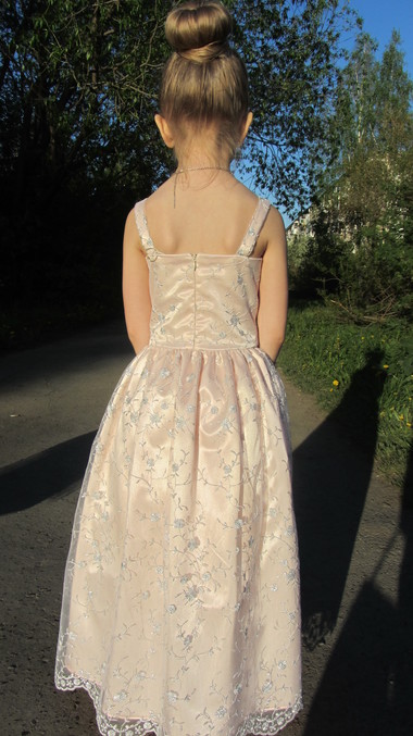 Ткань очень долго подбирала,купила за недели полторы где то.Ничего не нравилось.А это кружево увидела и поняла хочу из этого шить платье.Только дочка хотела белого цвета,но мне не очень понравилось как кружева смотрятся на белом атласе в сравнении с этим цветом.Она очень расстроилась,но когда увидела готовый результат не могу передать как она была довольна.