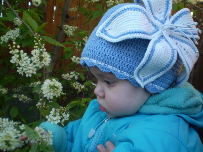 Шапочка связана навырост, так как сейчас у нас их уже с лихвой, успеть бы все поносить))) А эту планируем одеть через годик. Так что пока - только для фотосессии.