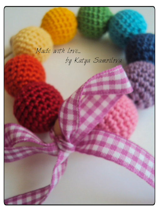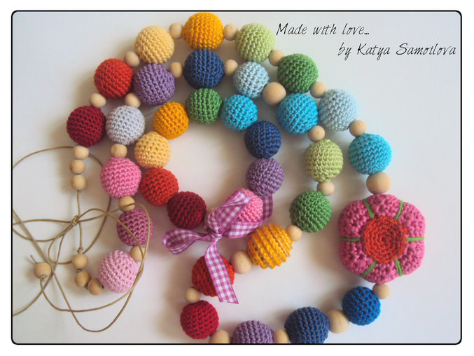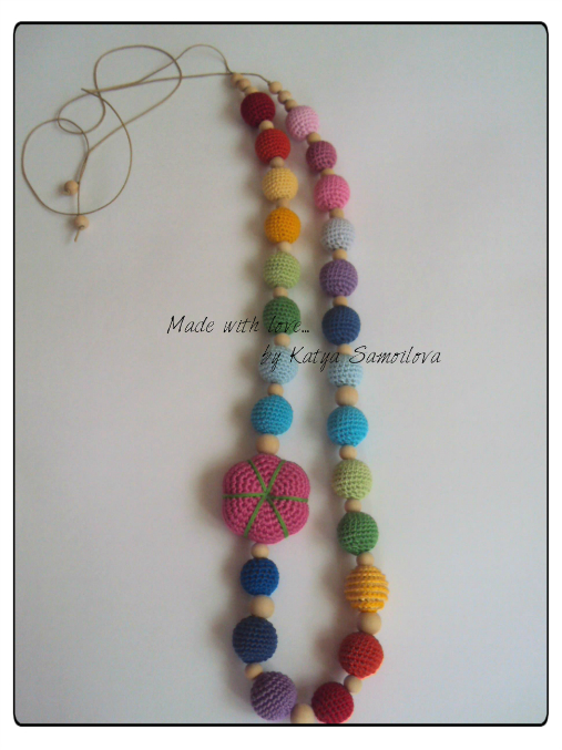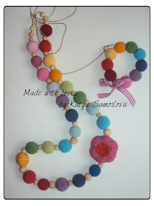 Связался на заказ для одной очаровательной малышки такой комплект: слингобусы и браслет "Яркий мир!". Длина бус 90см, все бусины необработанные, без лака; цветок мягконабивной (синтепух). Браслет на резинке, ленточка 100% хлопок. Нитки Бегония, крючок 2.