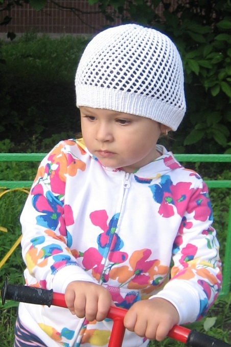 Белая шапочка связана из ниток Ализе Белла (50гр х 180м) 100% хлопок по кругу, для ОГ 51см набрала 116п, резинка 1х1 на спицах №2, основной узор на спицах № 3, узор простой 1р. все лицевые, 2р *2е вместе лицевой, 1 накид*-повтор до конца ряда, повторять 1р и 2р до нужной длины, затем *убавить равномерно половину петель, связать 4 ряда узором*, повторить еще 2 раза и стянуть оставшиеся петли, все. Ушло меньше мотка, связалось за 3 дня, вяжу когда дочка спит.