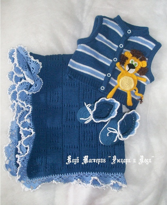 Очень порадовал меня процесс работы над этим комплектом. Коллега по работе на днях родила прелестного мальчишку Льва (имя выбрали давно) и комплект был подарком на рождение долгожданного первенца! Вязался легко и увлекательно, значит и малыш будет спокойным и послушным.