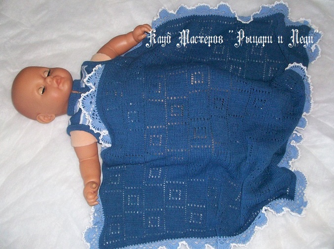 Основа пледа и жилет связаны на вязальной машине Нева-5-Ладога (ажур - ручная деккеровка), обвязка края, аппликация львёнка и пинеточки связаны крючком. Использовано на весь комплект 2 мотка синего цвета и по 100-150 метров белого и голубого цвета - пряжа YarnArt Cotton Soft (600 м в 100 г - 55% хлопок и 45% полиакрил) - более тонкий аналог YarnArt Jeans и для аппликации остатки акрила разной масти. Великолепно вяжется и на машине (плотность 5) и крючком (вязала №2, хотя рекомендован 2,5) - порадовало качество и цветовая палитра пряжи - замечательный выбор для летних детских вещей - петельки ровные, бархатные, пряжа не дубеет после стирки.
