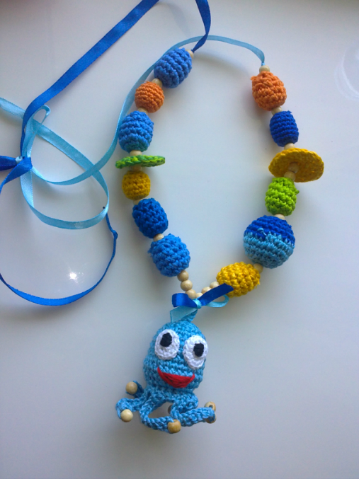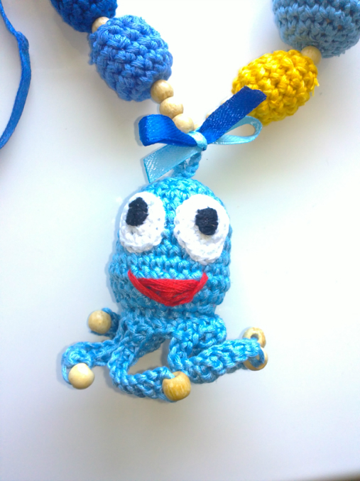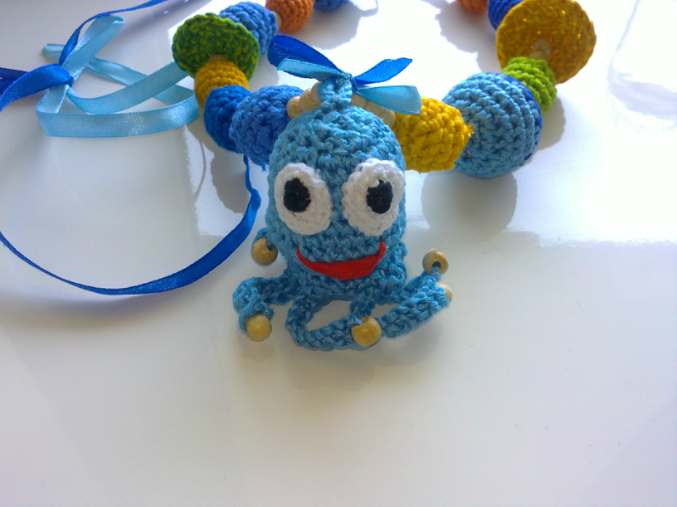 А вторые "Осьминожик". Обвязаны так же деревянные бусины, собраны на ленту. Осьминог гремит.
