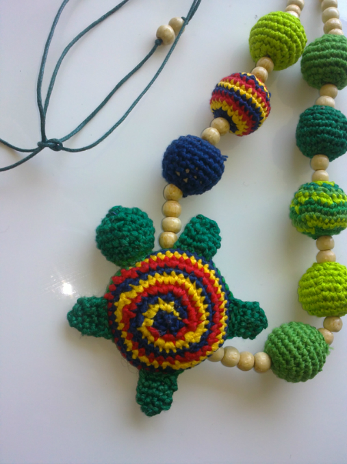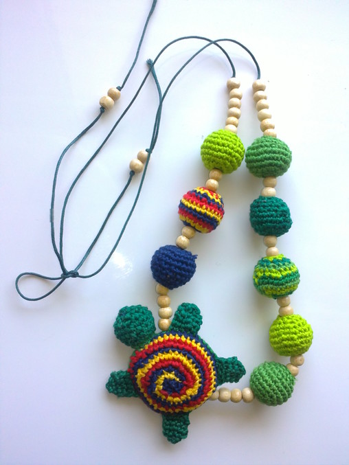 Первые бусики "Черепашка". Деревянные бусины и милая яркая черепашка, мягкая. Нитки хлопок 100%, собраны на вощенный шнур.