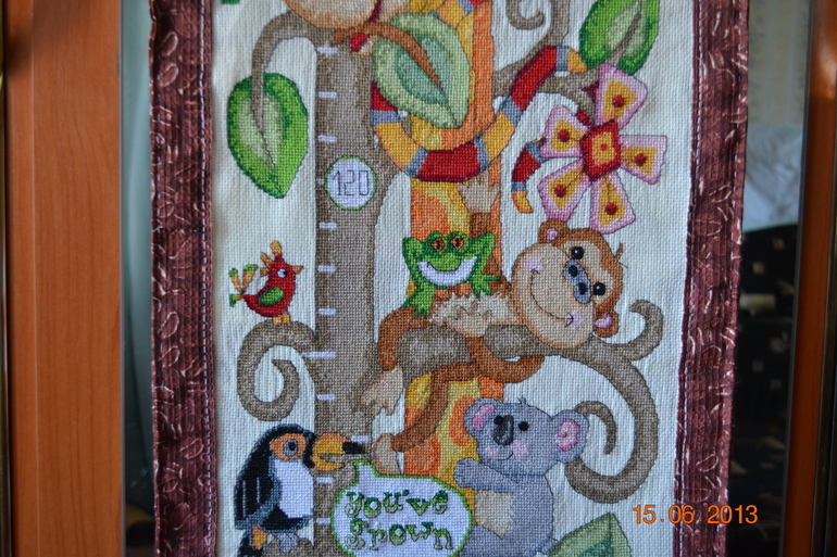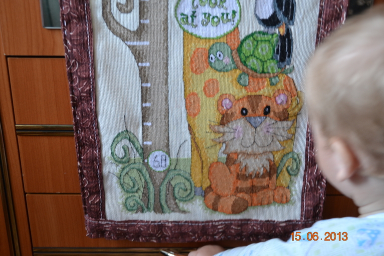 давненько не заходила на беби блог,а тут оказывается все поменялось,что я сразу и не разобралась! так вот за 3 месяца,ну или точнее если не считать перерывы то за 2 месяца,родился у меня такой вот веселый ростомер для сыночка!оформляла в ручную тоже,т.к. машинки швейной нет!результатом очень довольна,да и сыну очень понравился он!