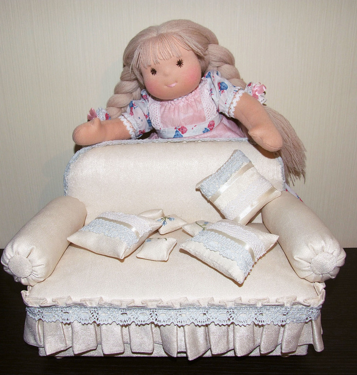 Это Розовое Облачко, рост 36 см., сделана полностью из эко-материалов, волосики вышиты. Диванчик-шкатулка, кукольная миниатюра,масштаб 1:6