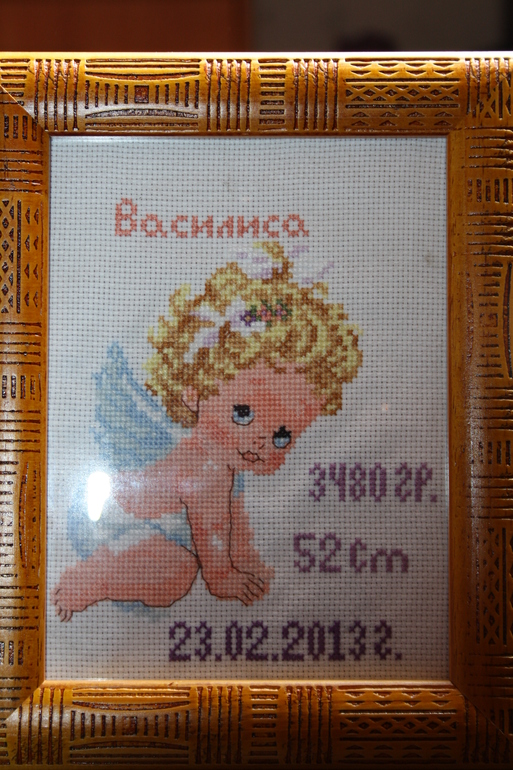 Решила вспомнить как вышивали в школе, да и повод был, у сестренки родилась дочка. Захотелось сделать что-то своими руками. Посмотрела на сайте вышивки крестиком, понравилось. Вот результат, правда без косяков не обошлось, ну и совсем не получился контур, точнее сказать мне не понравилось и я его распустила. Вот результат.