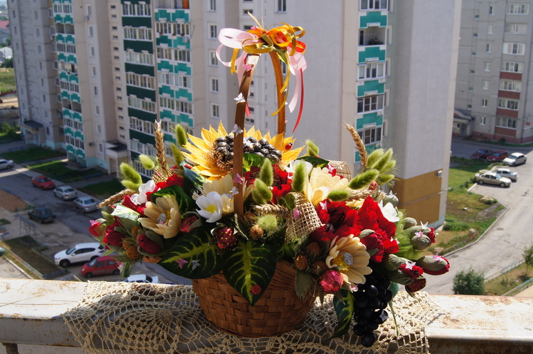 Такая "домашняя", "народная" корзинка. Я больна маками, поэтому им больше всего комплиментов. Так и кажется, что виноград сейчас повалит корзинку, но подсолнух ее крепко держит :))) Не страшно было на периле фотографировать? :)))