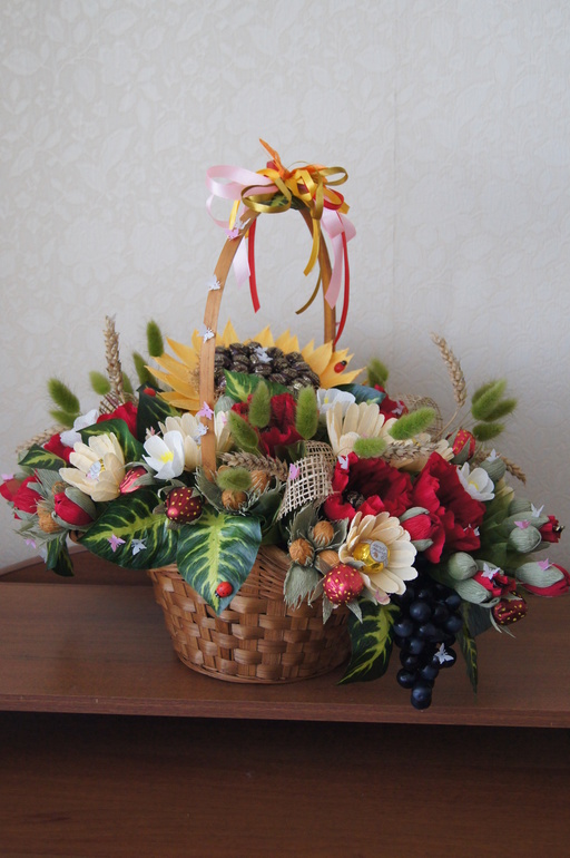 Может много фоток накидала, но по себе знаю, как иногда хочется рассмотреть работу со всех сторон, все детальки и мелочи, тем более в связи с присутствием в корзине подсолнуха практически реального размера, в посадке всех других составляющих отталкивалась от него, поэтому посадочка получилась не симметричная, хотя я симметрии и не добивалась, это задумка такая, что с одного края свисает виноград и цветочки.