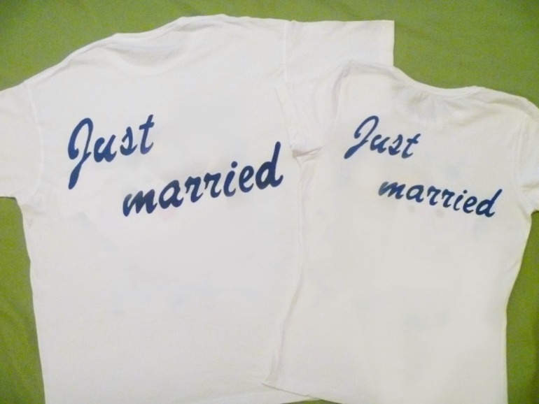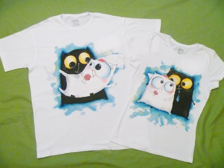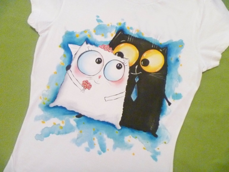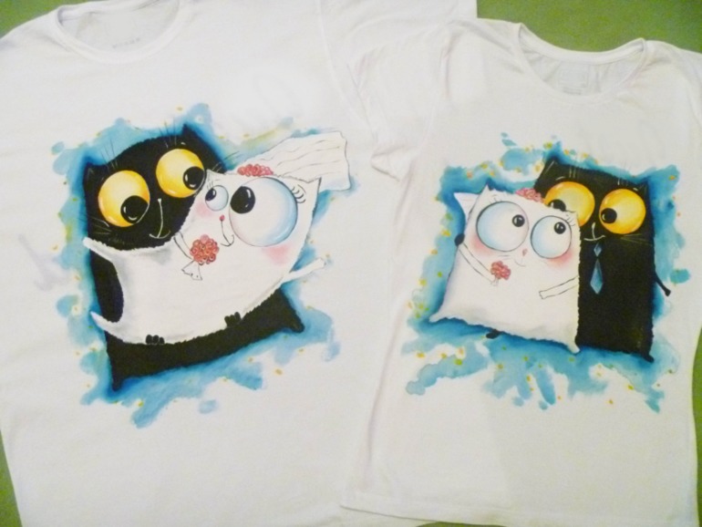 Роспись по ткани, батикВот такие забавные котики, мне они очень понравились, такие милые. На спине надпись "Молодожены"