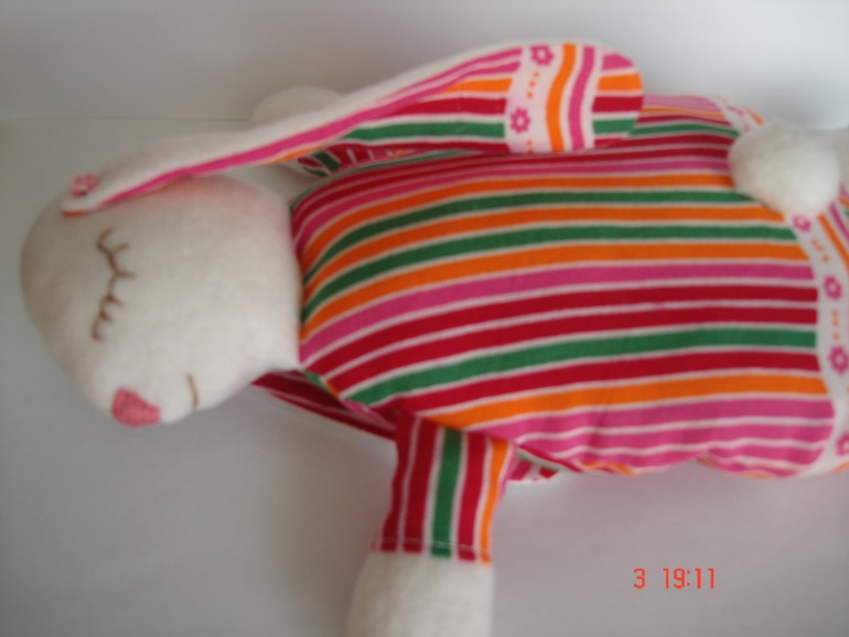Идею взяла из интернета там в туловище ложат вишнёвые косточки. У меня их нет и я наполнила просто синтепоном. Получилась зайка мягконькая))))