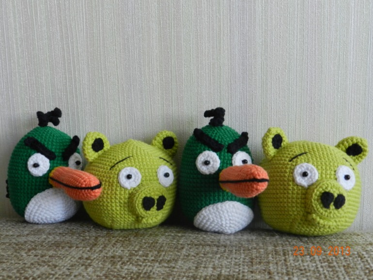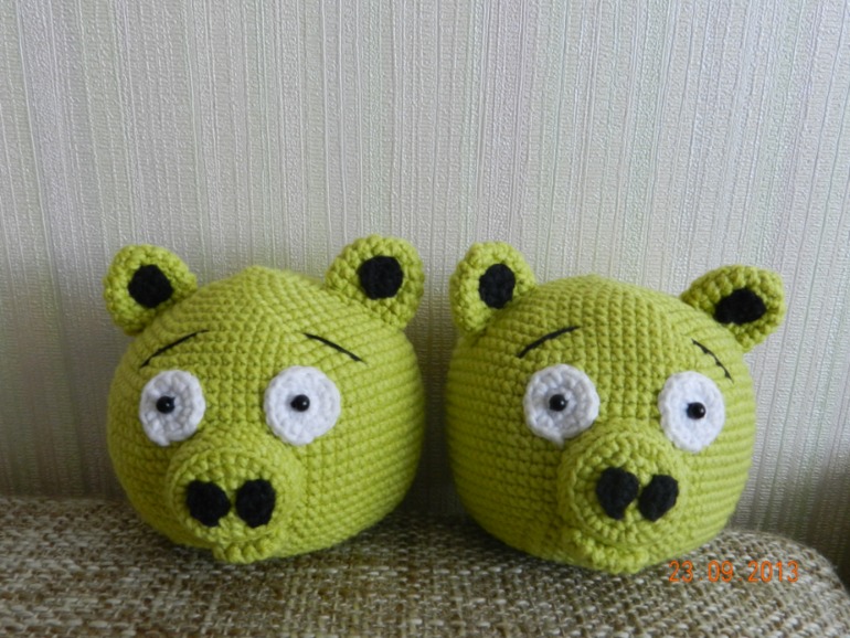 А внутри что? Холофай? Я тоже хотела таких вязать, только внутрь мячики вставить. И свиней побольше, чтобы из них башни строить, а потом сбивать)) Только руки никак не дойдут. А сколько пряжи ушло? По мотку каждого цвета хватит?