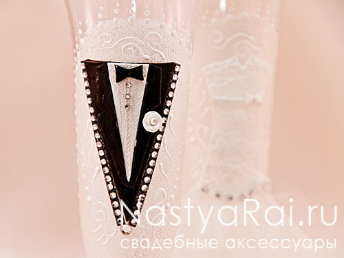 Рюши,ленты и стразы не могу представить,а вот если на бокале сделать аля смокинг бабочка и ворот красками...думаю будет солидно)