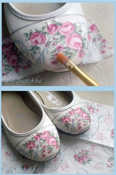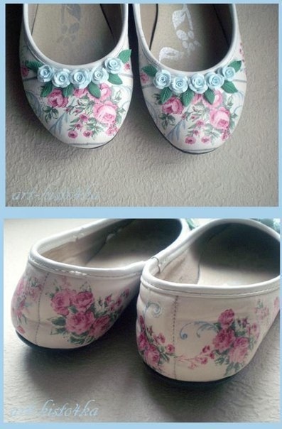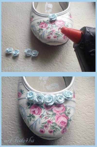 Всё,что угодно! Например пуговицы,бисер/бусинки,розочки из лент можно накрутить,связать цветочки или любую другую апликацию,можно готовые искуственные цветочки купить и приклеить. Я в магазине купила две одинаковые брошки и приколола на босоножки.