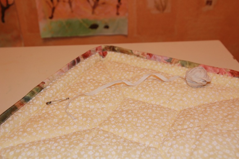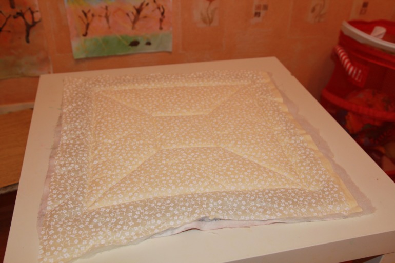 Для мягкости, положила 4 слоя синтепона + подкладка (хлопок с синтепоном). Стежку не планировала делать, но пришлось, чтобы после стрики слои синтепона не сбивались.