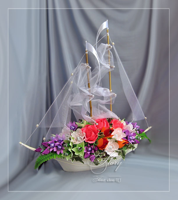 Решила попробовать себя в новом деле... Вот такой кораблик у меня получился. Впервые работала с гофрированной бумагой и клеевым пистолетом и вообще букет из конфет занятие для меня новое. Многие "косяки" вижу сама, но очень хочется услышать справедливую критику опытных рукодельниц. И еще возник вопрос и проблема:как при использовании клеевого пистолета избежать пузырей и просвечивания, когда на ровную поверхность клеишь? Помогите, пожалуйста, цветы нормально склеила, а вот кораблик...Юлия85