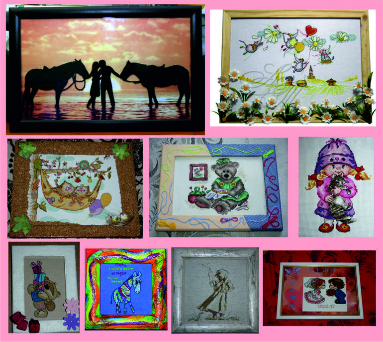 Что касается любимых работ, то они все любимые. если мне что-то не нравится, то никак не могу доделать. некоторые еще лежат не оформленные. мне нравится самой оформлять работы. 3 относила в багетку.