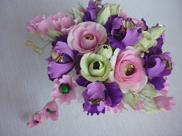 Могу предложить свои работы, могу http://www.livemaster.ru/myshop/marinaflowerВ сиреневых тонах вот такой букетик есть, 1100р. с конфетками Линд)
