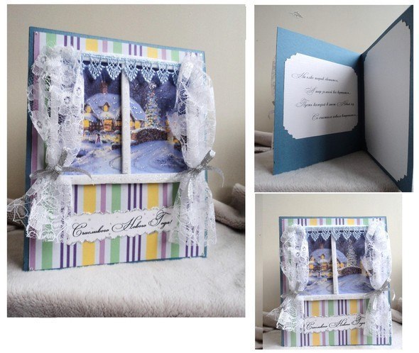 Говорят, что когда переезжаешь жить в новую квартиру первый Новый год надо отмечать именно там. Поэтому в этом году жду всех близких у себя и уже начала готовиться к созданию подарков. В этом году решила совместить свои увлечения,всех ждут сюрпризы , сделанные моими ручками, а еще каждый получит по открыточке. Это моя первая скрап открытка и мне где-то неудобно ее выставлять, так как конечно нужно еще много почитать о техниках , подкупить материал и продумать всякие мелочи, но все же...на ваш суд)