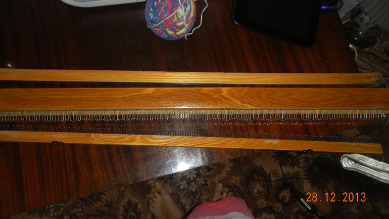 У меня бабушка на такой вязала,называла ее "буковинка"...валяется теперь это чудо без дела,не помню как на ней вязать,да и неохота...на спицах быстрее сбацаю) Вяжет она только лицевые ряды,т.е. получается платочная вязка или "веревочка"