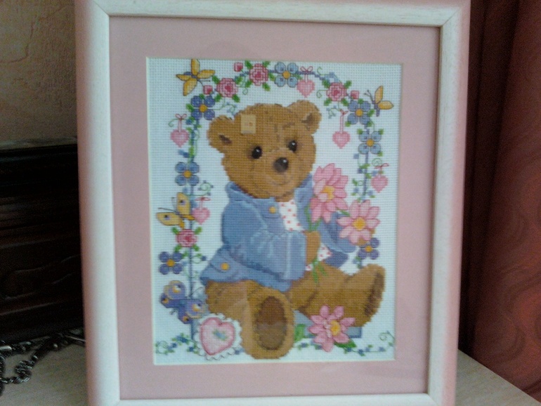 Замечательный мишка! А я вышивала пару лет назад, похожего мишку-мальчика, схема из журнала вышиваю крестиком. Тоже для детской комнаты!