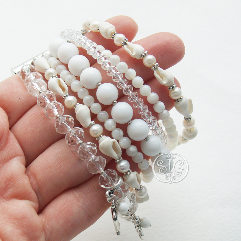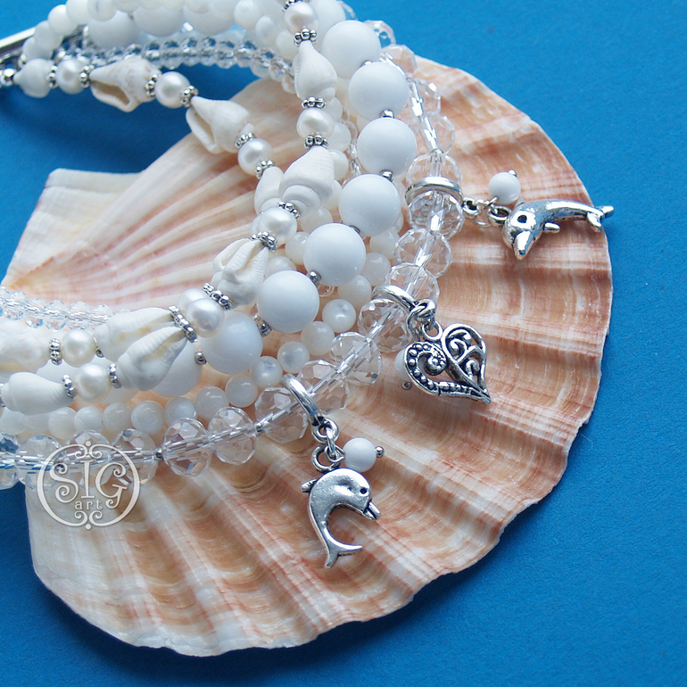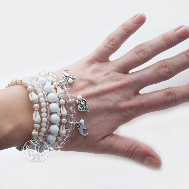 Бижутерия для слингомам. Слингобусы. Грызунки.Очаровательный нежнейший браслет в морском стиле! Настоящие ракушки, перламутр, жемчуг, белый агат и красивые подвески-дельфинчики. Талисман на любовь и на счастье!