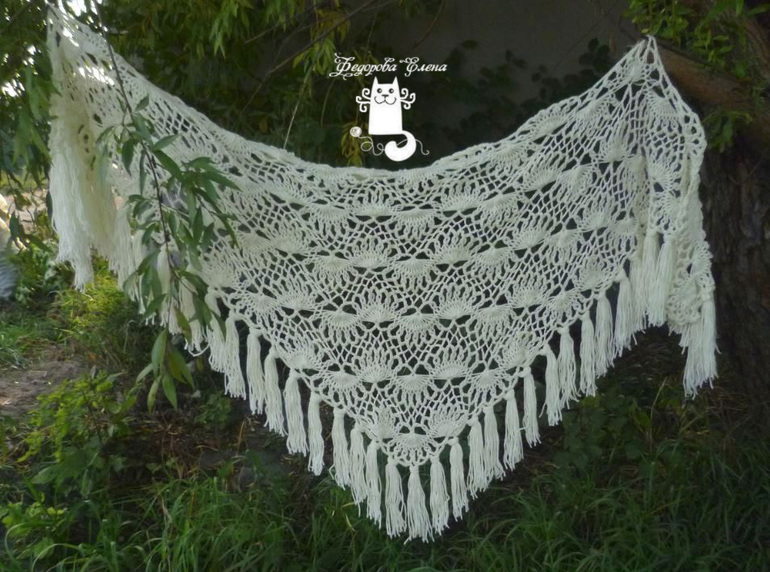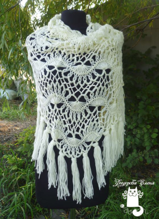 Мама 1,5 года назад ездила в отпуск и привезла из Германии пряжу себе на шаль (не удержалась и купила на распродаже моток 300гр), но она оказалась такая толстая, мама пробовала и крючком и спицами, получалось очень толстое грубое некрасивое полотно. И тогда я предложила связать на вилке, вот что получилось