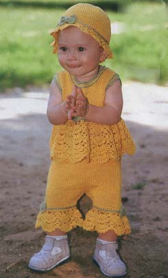 А я вязала желтый костюмчик, только красный верх спицами а низ крючком зеленый, и топик на кнопках на плечах был