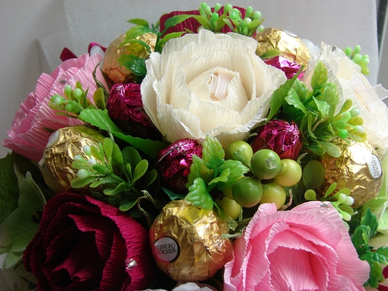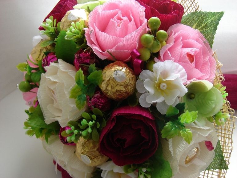 Розочки хорошие, а вот бантик какой то бедненький, просится пышный. И общий вид букета хотелось бы увидеть, а то все крупным планом.