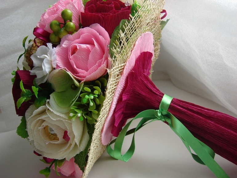 Цветочки красивые получились и цветовая гамма удачно подобрана. Мне не нравится оформление букета снизу. Особенно бантик, куцый какой-то.
