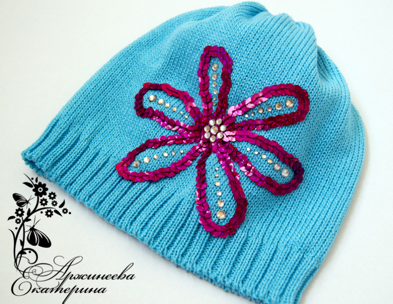 Связалась у меня сегодня позитивная, яркая шапочка расшитая пайетками и украшеная стразами, пряжа 100% хлопок, 44-48 см.