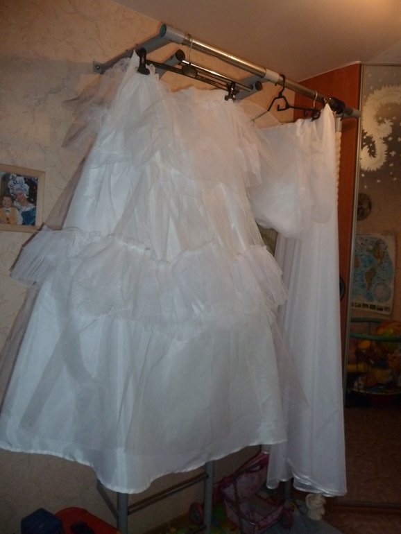В "комплекте" ещё прямая 3-ярусная фата из фатина с блеском, цветочки в причёску... потом выложу фото со свадьбы))