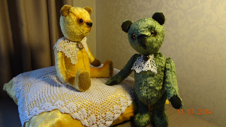 Игрушечный мир - животныеРодились мои мишки тедди 10.07.2014г. Сшиты полностью вручную из винтажного плюша,украшены также винтажным кружевом.. Набиты опилками,утяжелены гранулятом,сидят уверенно,стоят с поддержкой. На шплинтах. Глазки стекло,слегка тонированны постелью.Ростиком 33 и 30см. Имена еще не придумала,надеюсь найдутся для них мамочки и дадут сами имена.