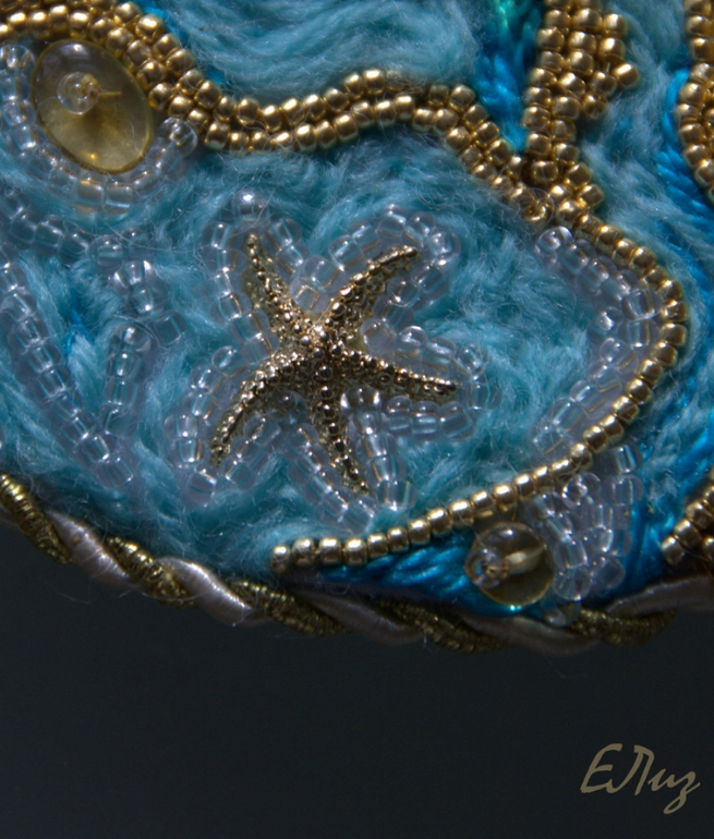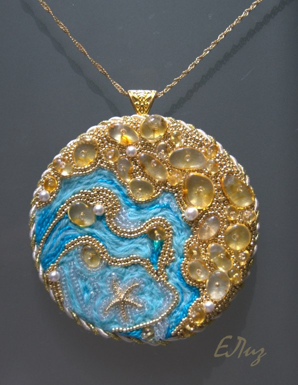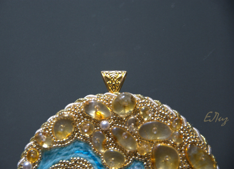 Как-то в начале марта прошлого года мне очень захотелось лета! Так и появился этот медальон, в котором сочетается деликатный блеск янтаря, подчёркнутый золотом бисера, и матовость бирюзовых волн.