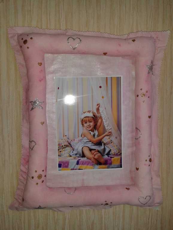 Попробую рассказать, если что спрашивай. Купила обычную рамку со стеклом, взяла старый пододеяльник белый, акриловые краски, холофайбер. Из рамки вынула стекло , положила на ткань сложенную в два слоя, обвела по внутр стороне рамку, вынула рамку и прострочила. Вывернула, разгладила швы и отмерила какой толщины хочу рамку, снова прострочила оставляя прорези для набивки. Набила, прошила, обрезала лишнее фигурными ножницами. Разукрасила акриловыми красками саму рамку и фон для фото. Собираем. Как то так.