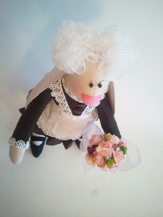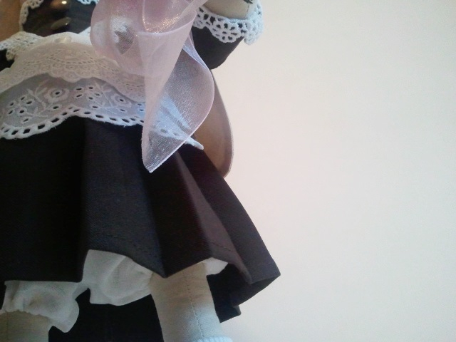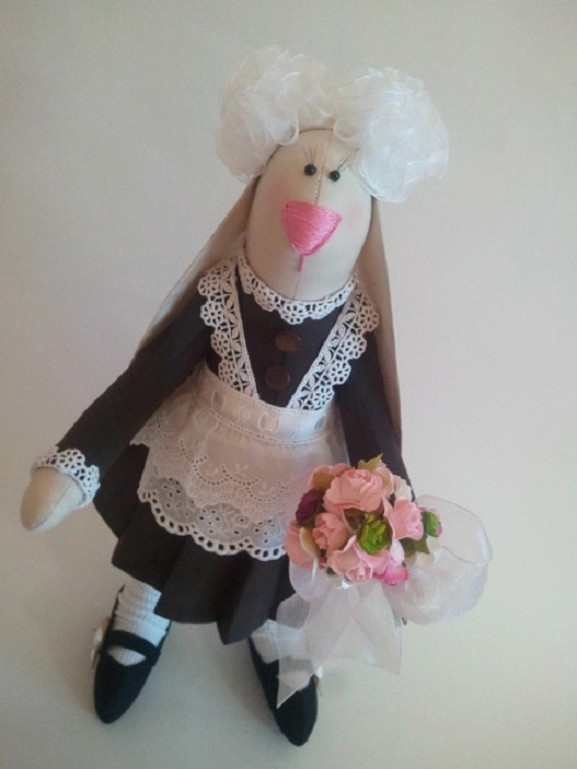 При изготовлении этой дамочки нахлынули на меня некие воспоминания о своем школьном детстве...)) Вот и форма вышла "как раньше", с белоснежным фартучком, манжетами, воротничком, большими бантами и нелепо приспустившимися носками